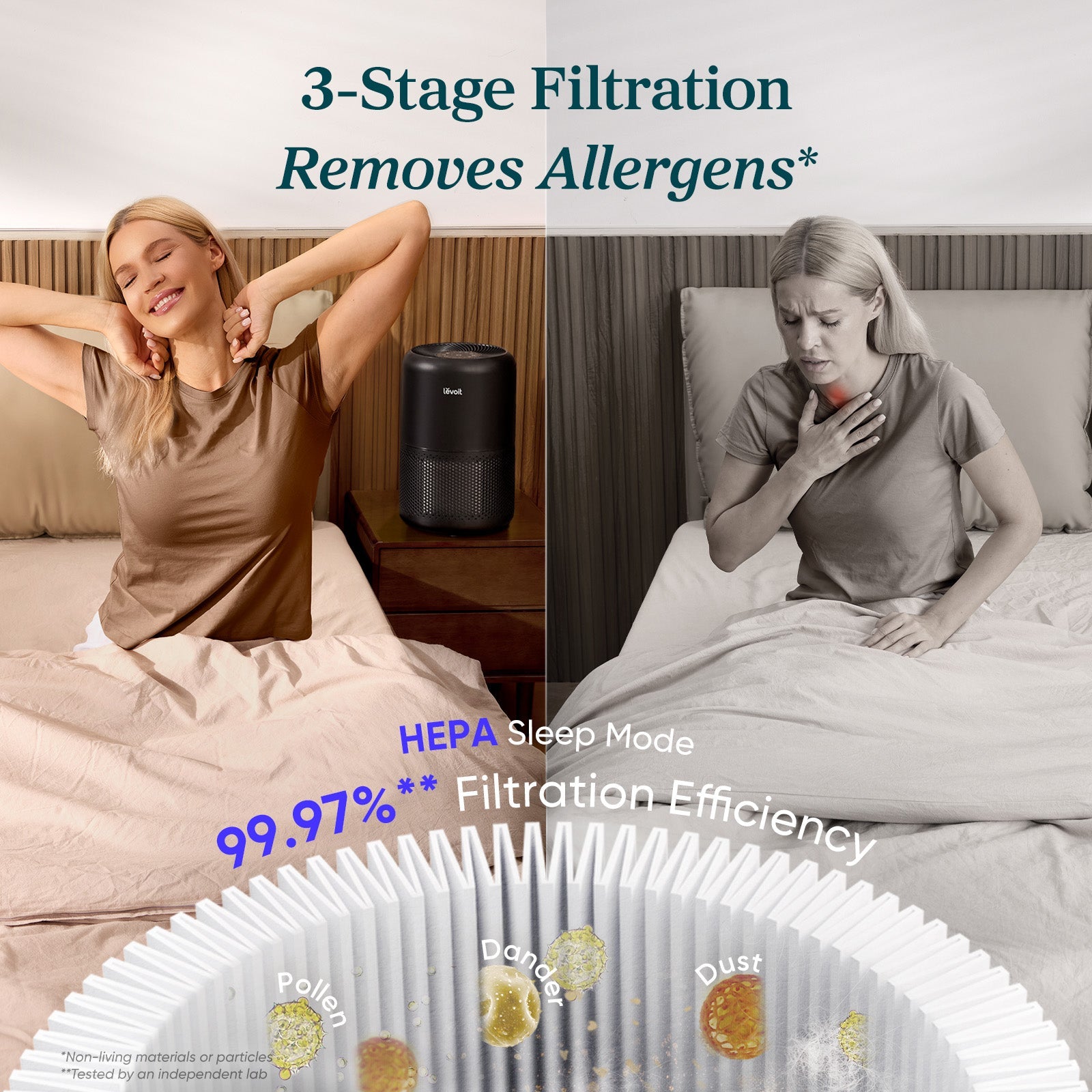 Fill your environment with fresh. clean air using Levoit’s Core? 300-P Air Purifier. Its patented VortexAir Technology spreads fresh air to every corner of your room. while its effective 3-stage filtration system captures particles such as fine dust. smoke particles. pollen. and pet dander.