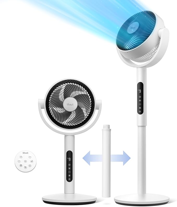 Stay cool with the Levoit CirculAir Pedestal Fan. featuring 5 high-performance blades. 9 speed settings. and wide oscillation for optimal air circulation. With an ultra-quiet 20dB DC motor. it’s perfect for bedrooms. offices. and living spaces. Enjoy customizable comfort with remote control. 120?? vertical tilt. and 90?? horizontal oscillation. Powerful. sleek. and whisper-quiet ?C the perfect fan for any room!